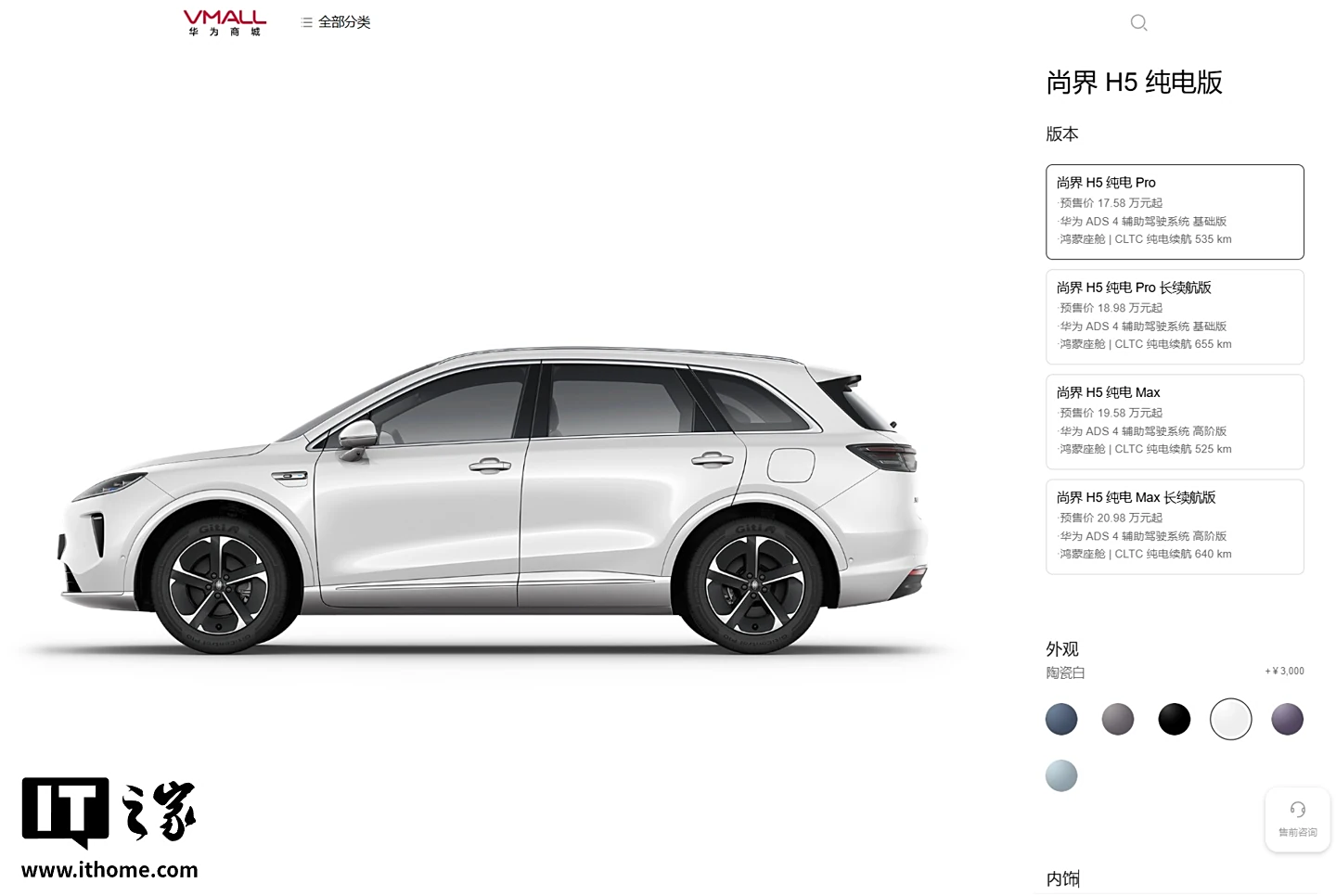 目前,尚界 H5 汽车的选配页面已公开,其中搭载华为 ADS 4 辅助驾驶高阶版的车型最低 18.98 万元起。具体如下: