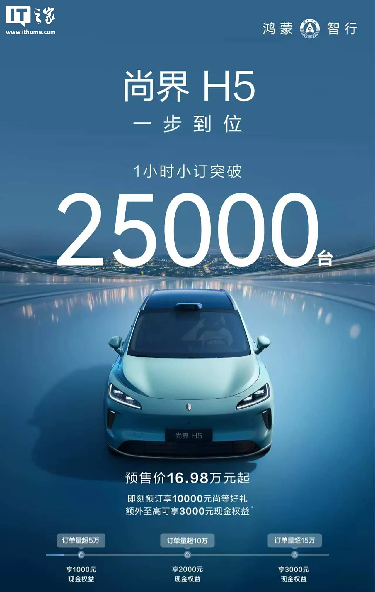 IT之家从鸿蒙智行官方获悉,尚界 H5 一步到位,新车上市 1 小时小订突破 25000 台。